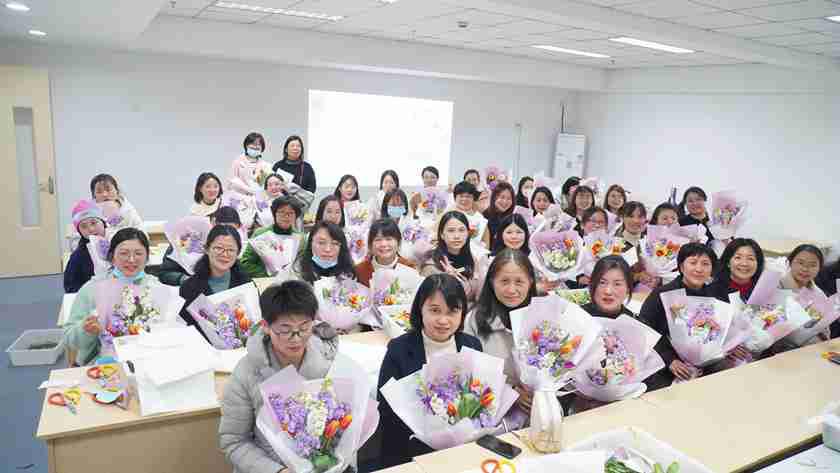 课上,花艺老师首先介绍了本次活动的花材种类、单个花材的养护、插花架构、色彩搭配、整体作品养护、花艺知识拓展等内容,讲解了手捧花制作的重点难点。随后,女职工们跟随老师的讲解内容和操作手法,从鲜花的取材、剪叶、布局开始,不断的进行尝试和实践。经过一个多小时的亲手实践,一枝枝花朵变成了充满艺术性的手捧花。活动最后,公司女职工还与自己亲手制作的手捧花进行了合影留念。