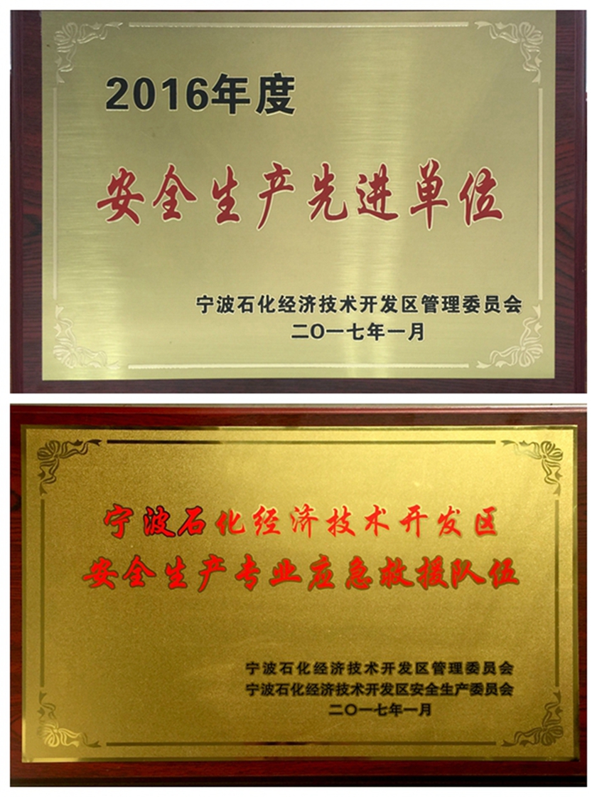 近日,在宁波石化经济技术开发区2017年度安全环保工作会议上,公司被授予2016年度 “安全生产先进单位”和“应急救援先进单位”称号,公司应急救援队获得“安全生产专业应急救援队伍”、公司员工唐利华获“应急处置技能培训先进个人”荣誉。