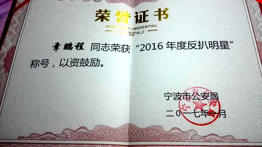 动态速递 公司发展部章鹏程荣获宁波市“2016年度反扒明星”称号