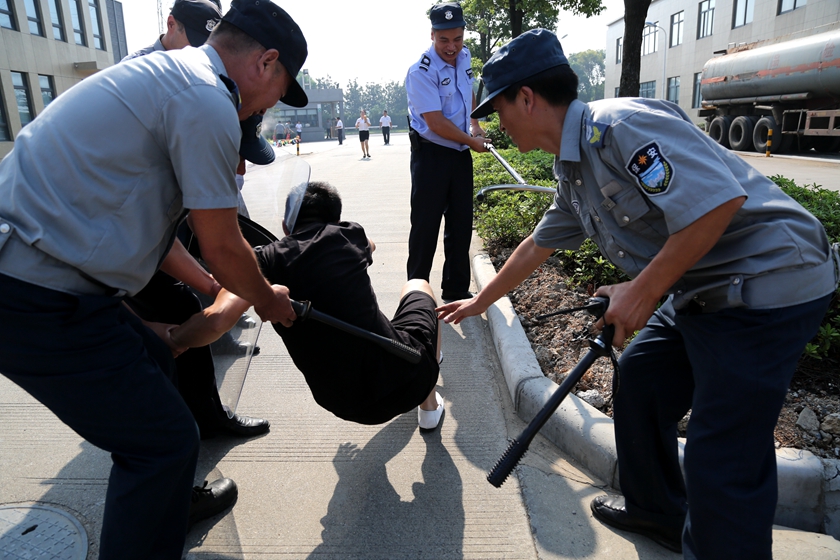 在对日常工作中形象、礼仪、军姿、体能等项目进行重点集训之后,演练9时正式开始。公司保安人员在巡逻工作中发现可疑人员翻墙进入公司,立即上前严厉阻止,其他执勤保安通过对讲机了解此突发事件后,立即打电话通知报告保安队长和中控值班长。值班长随即汇报公司领导,并启动公司防恐防暴应急预案,集结保安队员进行围堵,同时通知各生产岗位做好安全生产和装置保卫工作。危险分子见事情暴露后企图冲进生产装置区纵火,被把守在生产区门禁的保安人员奋力阻止,为成功围堵赢得了宝贵时间。此时,恼羞成怒的歹徒拿刀意图伤人,支援保安兵分两路,一路手拿防暴器材联手制服,一路迅速用灭火器熄灭燃烧在空地上的燃烧弹,警报解除,歹徒被扭送派出所。