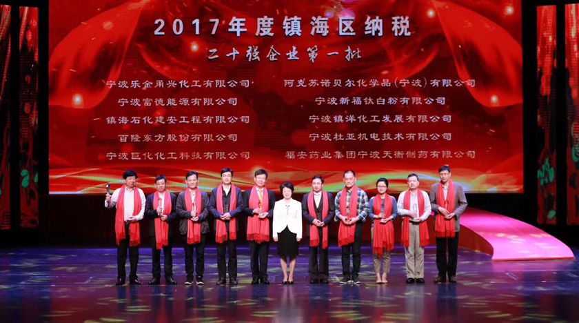 4月3日,镇海区召开经济工作会议,对2017年度经济工作先进单位及个人进行了表彰,公司荣获镇海区纳税二十强企业(第八名),登台接受区委书记林雅莲颁奖。