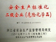 近日,经浙江省安全生产标准化技术委员会专家组认真严格的考评,公司顺利通过了安全生产标准化二级达标评审,获得了省安全生产监督管理局颁发的“危险化学品安全生产标准化二级企业”证书和牌匾。